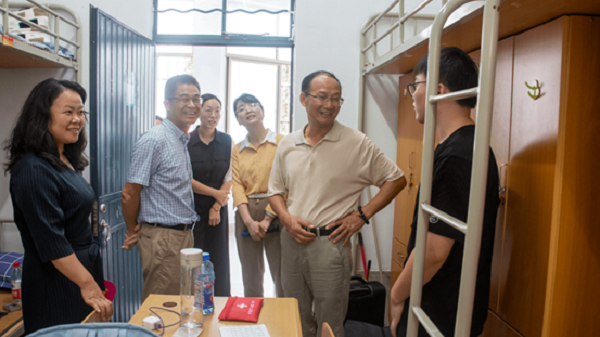 陈龙春一行先后检查指导了学校及各二级学院的绿色通道工作情况并深入走访寝室,亲切慰问新生住宿情况。