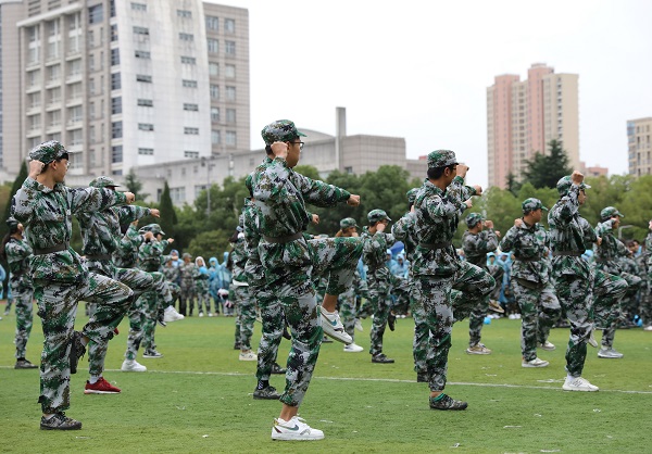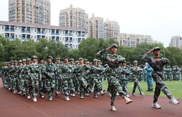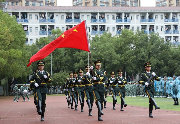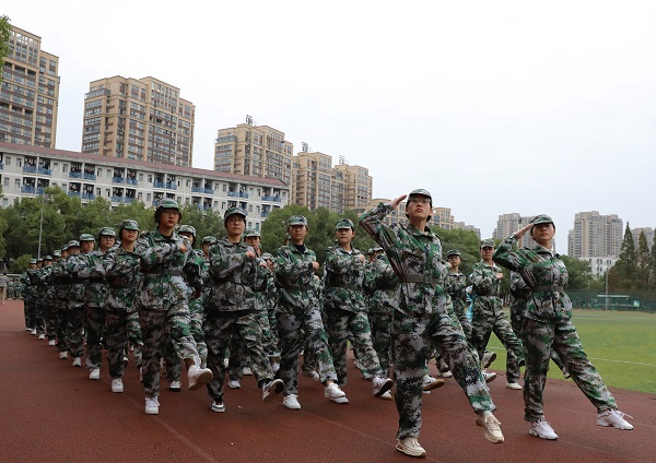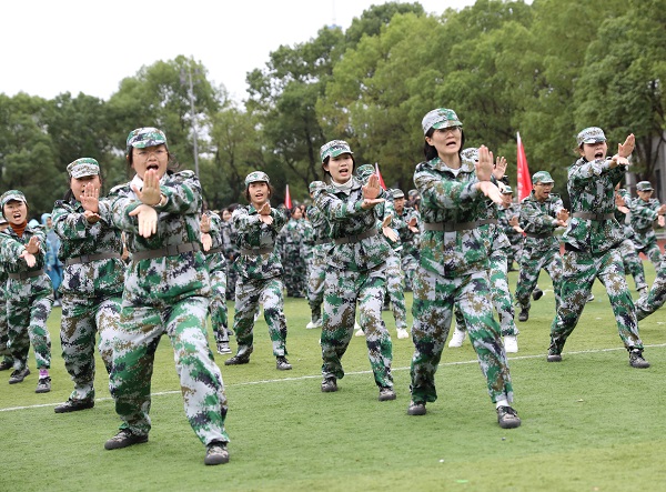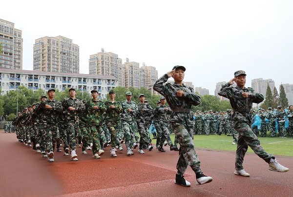 一声令下,军训汇报表演开始。5个营10个方阵的学生连队沿着阅兵道依次经过观礼台。他们身着迷彩,昂首挺胸,步履坚定,以整齐划一的步伐、刚劲有力的摆臂和清脆嘹亮的口号,展示了湖院学子积极向上的精神风貌。