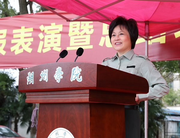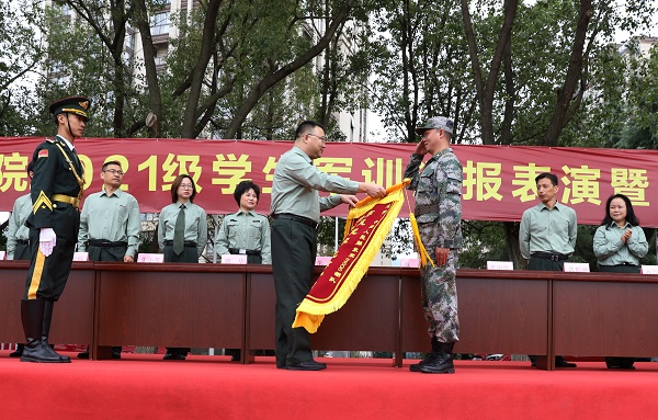 党委副书记唐华作总结讲话。她首先向各位承训教官和为本次军训做好组织和后勤保障的所有老师们表示感谢,为每一位高标准、高质量、高水平地完成参训科目的同学点赞。她表示,军训是大学学习的必修课,也是挥洒青春热血的第一章。大家要把军人的意志与精神带入到学习与生活中去,增强自身爱国意识、身体素质、团结意识,永远怀揣一颗爱国爱党的赤子之心。