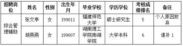 根据《2022年上半年湖州市市级机关事业单位招聘编外工作人员双选会公告》,在办理聘用手续前放弃聘用资格的,报人社局同意,在相应岗位考核人员中按总成绩从高分到低分依次递补。现将递补人员情况予以公告: