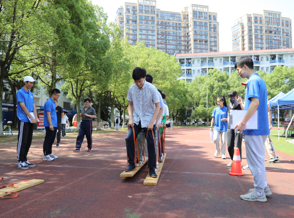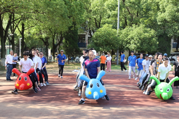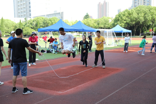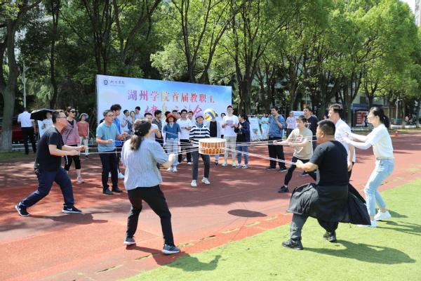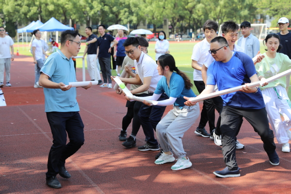 此次活动是学校首届教职工健身运动会,旨在增进广大教职工之间的交流互动、增强各单位的团队凝聚力,充分激发教职工的朝气与活力,展现永利官网教职工的良好精神风貌。比赛共设5个集体项目:同心鼓、8字跳绳、大脚板、旱地划船、流水作业。项目的完成需要参赛队员的聪明才智、默契配合、团队协作、吃苦耐劳,体现了竞技与趣味的有机统一。尽管当天气温较高,但老师们的热情却没有一丝减少,田径场上,欢笑声、加油声此起彼伏。一个个项目顺利进行,掀起了运动会的一个又一个高潮。校党委书记朱斌等校领导也走进赛场、融入团队,和老师们一起参加比赛。参赛队员们齐心协力、努力拼搏、共同合作、勇往直前,出色完成各个项目的比赛,整个体育场洋溢着一片欢声笑语。