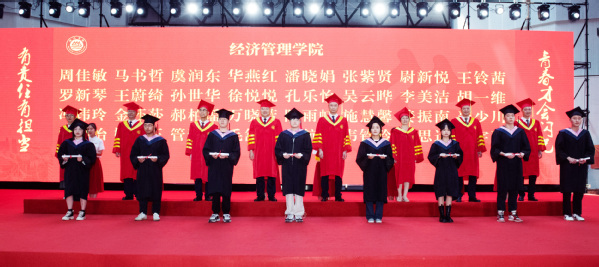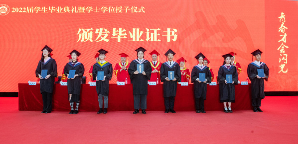 毕业典礼在雄壮激昂的国歌声中拉开帷幕,校党委副书记唐华宣读2022届毕业生名单及学士学位获得者名单。校领导为毕业生代表颁发毕业证书并合影留念。