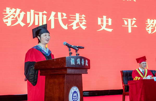 教师代表理工学院史平教授以自己的亲身求学和工作生活经历,鼓励同学们要在今后的工作岗位上不断努力学习,不断充实和提高自己的知识和技能,奋发进取,成长为一名立足于岗位、独当一面的优秀人才。她代表学校全体教师,希望同学们在今后的人生旅途上,都能始终怀着一颗感恩的心,做到眼里有爱,心中有光,乘风破浪,勇敢前行。