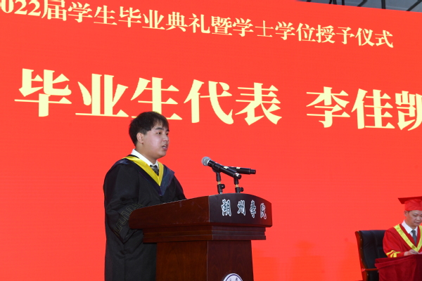 毕业生代表理工学院光电信息科学与工程2018级李佳凯深情回顾了在校四年的求学和创业历程,他对同学的朝夕相伴、老师的谆谆教诲和母校的辛勤培育表达了深深的感谢,同时表达了对未来留湖创业的美好期待。他代表全体毕业生衷心地祝愿母校的明天更加美好,向老师们送上美好的祝福。