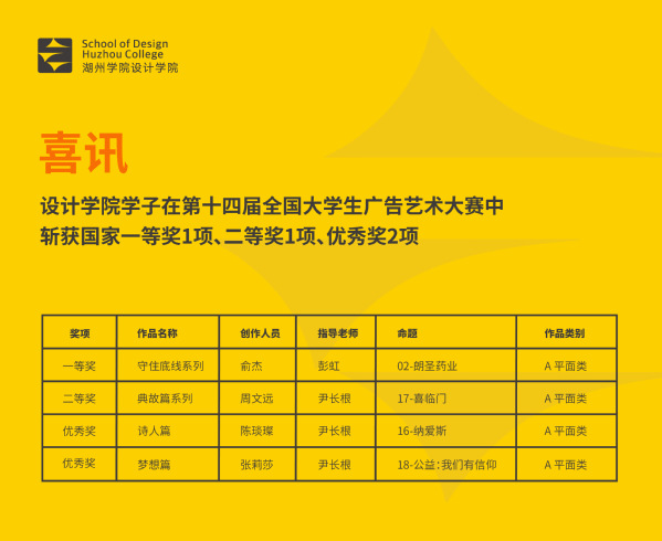 日前,由教育部高等教育司指导,中国高等教育学会、教育部高等学校新闻传播学类专业教学指导委员会共同主办的第十四届全国大学生广告艺术大赛全国总评审工作落下帷幕。学校设计学院学子在此次比赛中,斩获平面类全国一等奖1项、二等奖1项、优秀奖2项,取得了该项赛事全国一等奖零的突破,浙江赛区平面类仅有七所高校获得全国一等奖。