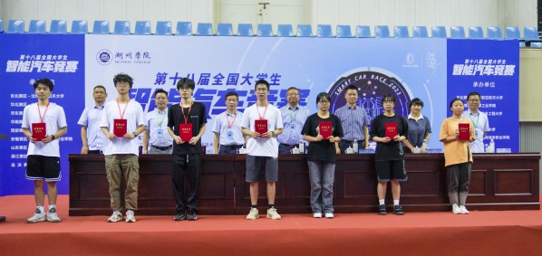 浙江省大学生智能汽车竞赛组委会秘书长,杭州电子科技大学教务处副处长王震教授宣布比赛成绩,主席台嘉宾为获奖人员颁奖。