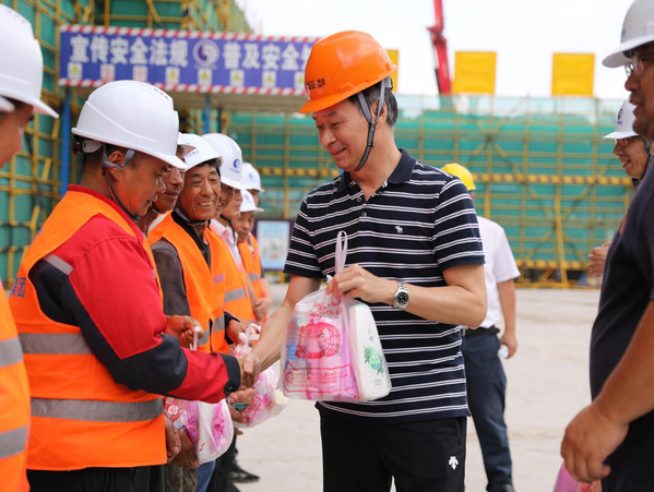 马志和一行实地走访了新校区一标段和二标段建设现场,听取了代建单位房总集团关于现场施工进度、施工工艺和安全生产措施的介绍。在新校区两个标段现场,马志和为高温期间仍坚持奋战在施工一线的工程建设者送去关怀,对他们为新校区建设所付出的辛勤劳动表示敬意和感谢。随后参观了一标段项目现场智慧工程展厅,体验智慧工地、安全生产相关内容,并对相关工作提出了指导意见。