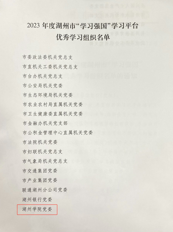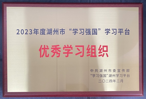 近日,中共湖州市委宣传部印发《关于公布2023年度湖州市“学习强国”学习平台优秀学习组织名单的通知》,8858cc永利官网党委被评为湖州市“学习强国”学习平台“优秀学习组织”。