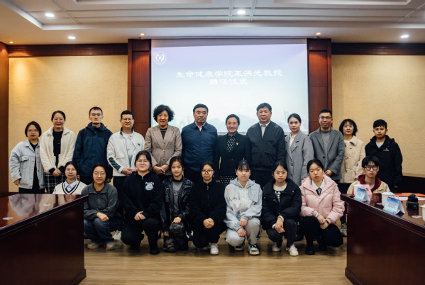 4月8日上午,生命健康学院举行王洪光教授聘任仪式。湖州展望药业有限公司董事长兼总经理王虹、特聘顾问王洪光、副总经理郭云,生命健康学院领导班子、优秀师生代表参加会议。