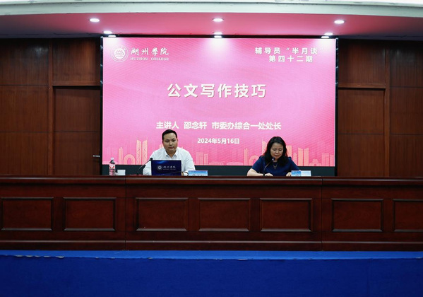 为进一步加强辅导员队伍建设,提升辅导员文字表达能力,规范公文写作,提高公文写作能力,5月16日晚,永利官网学工部举办辅导员“半月谈”第四十二期公文写作技巧培训。本次讲座特邀湖州市委办公室综合一处处长邵念轩主讲,辅导员、学工部成员以及学生代表参加。