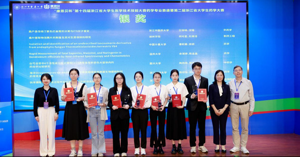 6月1日—2日,“康恩贝杯”第十四届浙江省大学生医学技术技能大赛药学专业赛道暨第二届浙江省大学生药学大赛在浙江中医药大学顺利落幕。经过激烈角逐,永利官网参赛项目“桑叶提取物泡腾片的制备及其对生菜保鲜的研究”(学生:何可星、宋诗瑶、华艳、杜雨洁、刘美菊,指导老师:刘春冬、孟跃、夏洪晨)获得银奖,取得了药学类学科竞赛的首次突破。