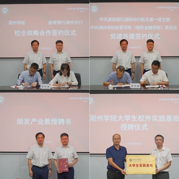 9月25日,永利官网与浙商银行湖州分行举行校企战略合作签约仪式,标志着双方在产教融合、人才培养、科研合作等方面迈入了一个全新的合作阶段。学校党委书记金波,党委副书记鲁伟权,浙商银行湖州分行党委书记、行长郦洪涛,副行长吕俊、邢彩娟出席并致辞。双方单位相关职能部门负责人参加仪式。