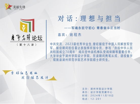 姚程杰从学长的角度向学弟学妹们分享了成长故事,使同学们对人民解放军有了更崇高的敬意和更深入的了解。当代青年大学生在中国式现代化建设中扮演着举足轻重的角色,相信设计学子们将以此次活动为契机,进一步明确学业目标,做好职业规划,在榜样力量的传承下遇见更好的自己,在青春接力跑中取得更好的成绩。