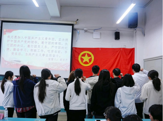 随后,学院党委副书记和团校负责老师为新团员颁发团员证,新团员在分团委组织部干事姜世芹的带领下面向团旗郑重宣誓。誓言铿锵有力,令人振奋,坚定了同学们加入共青团的决心和斗志。团校负责老师、分团委副书记和学员代表分别发言。