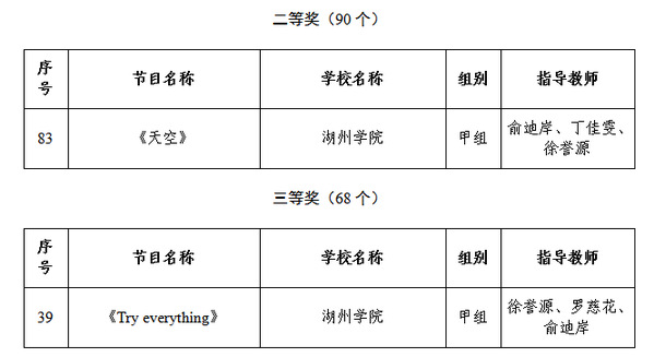 本届省大学生艺术节活动以“民族魂·中国梦”为主题,涵盖器乐、声乐及十佳歌手三个类别,共评出合唱、合奏和校园十佳歌手获奖节目450个。由俞迪岸、丁佳雯、徐誉源老师指导的声乐作品《天空》荣获二等奖,徐誉源、罗慈花、俞迪岸老师指导的《Try everything》荣获三等奖。