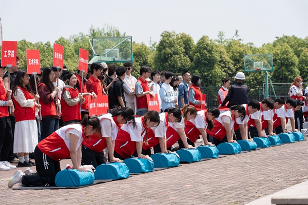 中午12时30分校园响起急促的警报声,演练正式拉开帷幕。消防救援队进行了消防演练,参演师生按照预案要求,沉着冷静、快速有序地从学生公寓区疏散到指定安全区域。现场师生志愿者们还进行了应急救护知识培训,演示了心肺复苏、创伤救护等实用技能。