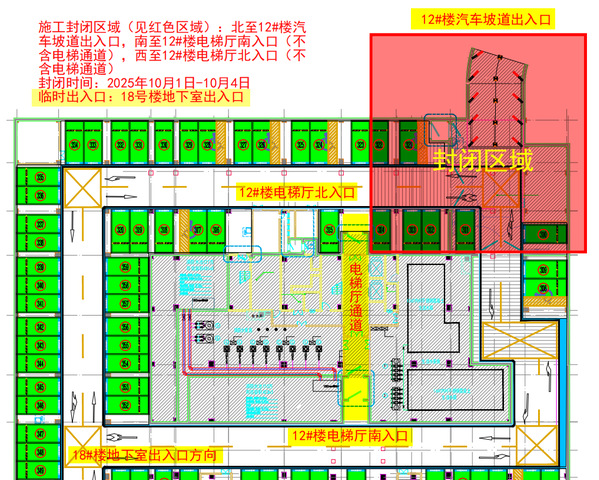 三、10月1日至10月4日,对行政楼地下车库入口段环氧地坪污损区域进行修复,具体为:北至12#楼汽车坡道出入口,南至12#楼电梯厅南入口(不含电梯通道),西至12#楼电梯厅北入口(不含电梯通道)。施工封闭期间请走18号楼地下室出入口。详见示意图: