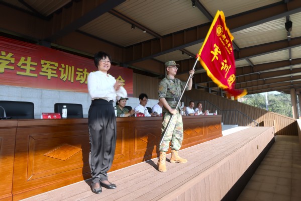 唐华向军训团授旗并作军训动员讲话。她用“阅兵精神”为新生们描绘了青春的壮阔画卷,用“长安街”的比喻为军训赋予了神圣的使命感。为帮助同学们更好地完成军训任务、真正锤炼自我,她希望同学们对标向前,定准人生的航向;踢腿生风,突破自我极限;落地砸坑,踏响时代节拍,祝福同学们在湖院走出无愧于时代的青春之路,书写人生最美的篇章。