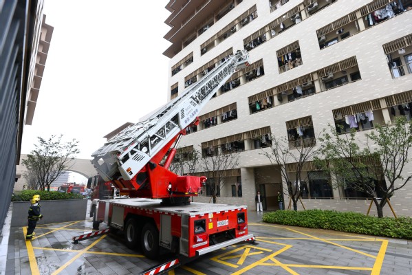 12时40分演练准时开始,随着急促的消防警报声响起,宿管员和公寓老师迅速引导楼内学生快速撤离。学校安保人员赶到现场,拉起警戒线,快速引导路面人员有序疏散。西塞山特勤站接119调度后,迅速抵达现场,水罐消防车在楼外压制火势,云梯消防车对被困高层人员实施高空救援。与此同时,南太湖医院救护车及时赶到,对受伤人员展开现场急救。经多方协同配合,楼内外明暗火全部扑灭,火灾彻底得到控制。
