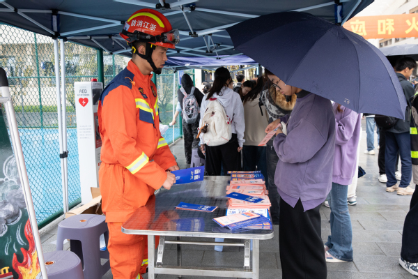 疏散集合地西区体育场设置了5大安全教育宣传活动区,包括反诈、实验室安全宣传、安全知识有奖竞答、AED应急救护演示、消防设备参观。消防工作人员展示了消防个人防护装备、抢险救援器材等多类特种装备,并演示其用途、性能与使用方法,助力参与人员提升消防安全知识水平。